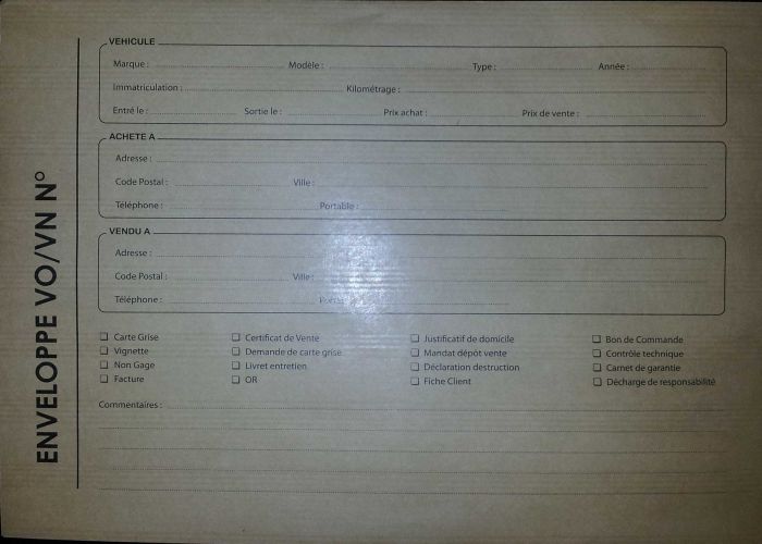 L'impression monochrome personnalisée sur la face avant intègre de manière structurée les zones dédiées aux informations du vendeur, de l'acheteur et du véhicule. Nos Enveloppe VO-VN sont spécialement conçues pour faciliter l'organisation et le classement des documents. Cette organisation rationnelle des données facilite considérablement le suivi administratif et permet une identification immédiate des dossiers. Les champs préimprimés relatifs au règlement offrent également un cadre professionnel pour la partie contractuelle.